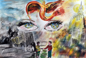 L’elaborato grafico realizzato da Rosy Scarlata vuole rappresentare il senso di rinascita che si avverte nella vita di tutti noi quando la solidarietà e la pace prendono il posto della guerra e dell’odio.