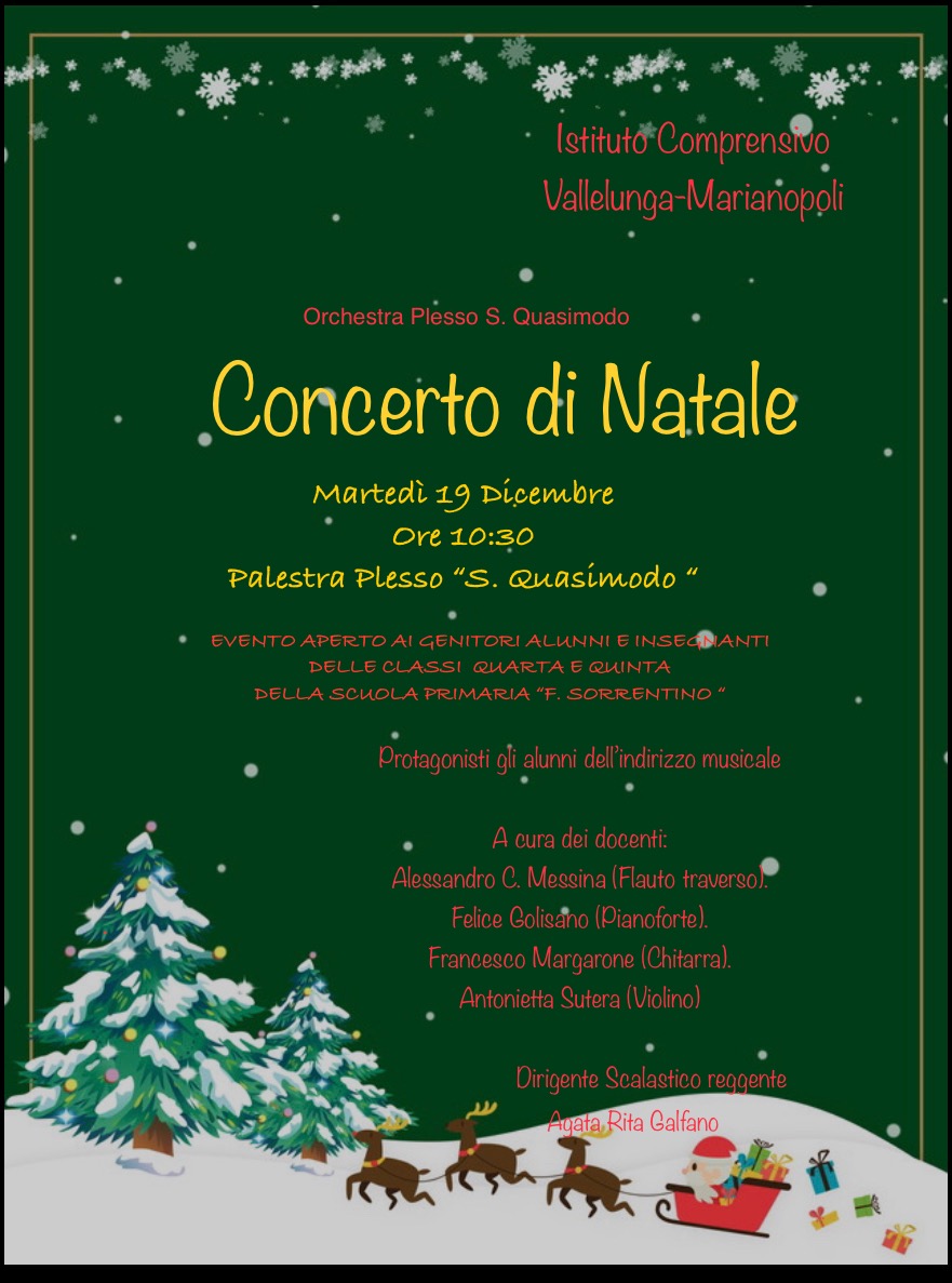 Gli alunni, gli insegnanti e i genitori delle classi IV e V della Scuola primaria di Vallelunga sono invitati a partecipare al Concerto di Natale preparato dagli alunni corso musicale della Scuola secondaria di primo grado che sarà realizzato giorno 19 dicembre 2023, alle ore 10:30, presso la Palestra del plesso “S. Quasimodo”.