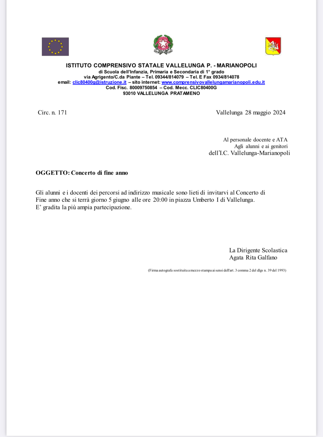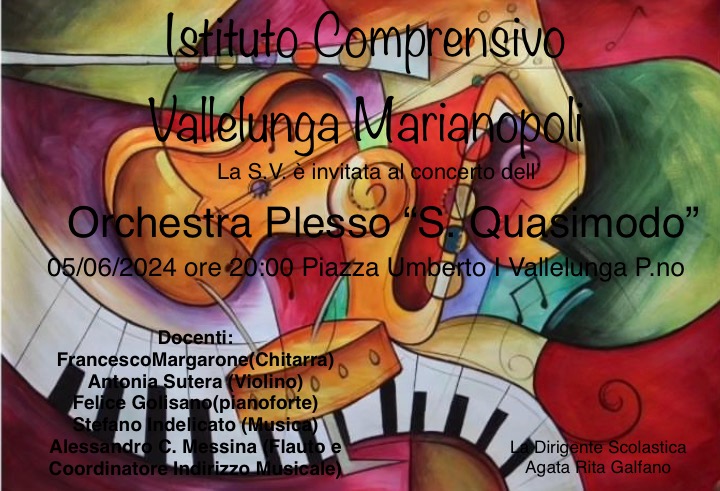 Le SS.LL. sono invitate a partecipare al Concerto di fine a.s. 2023-24 preparato dai docenti e dagli alunni del corso musicale della Scuola secondaria di primo grado di Vallelunga che si terrà presso la piazza Umberto I di Vallelunga P.no giorno 5 giugno 2024, alle ore 20:00. L’evento è patrocinato dal Comune di Vallelunga.